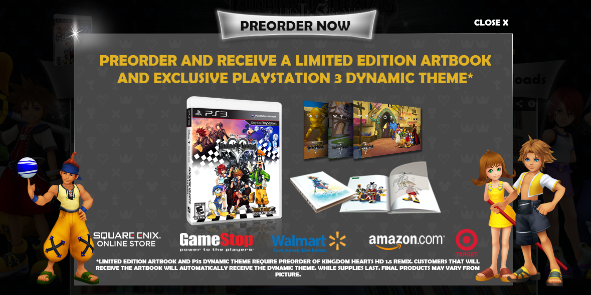July 18, 201312 yr Square Enix have updated the official Kingdom Hearts portal website with an image describing the pre-order bonuses for Kingdom Hearts HD 1.5 ReMIX. This image details the 24-page artbook, as well as the recently announced PlayStation 3 dynamic theme. Note that this is the first time we've seen what appears to be the cover of the artbook, as well as a couple of new pages from the inside. Enjoy this sneak peek!