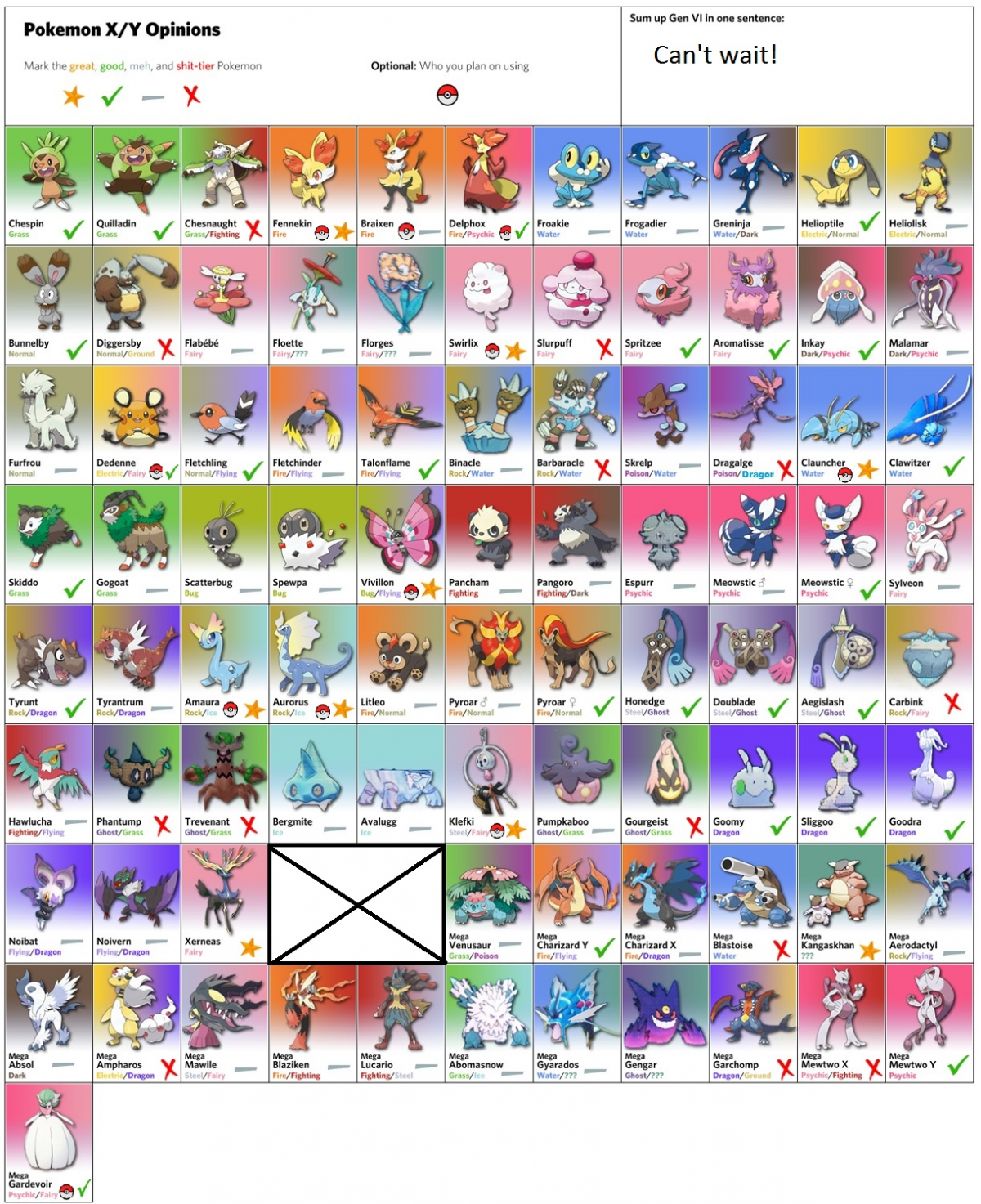 I decided to do this chart so I could show you all my opinion of the gen VI pokemon. Sorry for the OCD inducing X in the middle. Anyway feel free to share yours.
