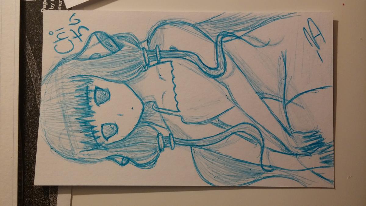 So I was in a sketching mood while watching Chobits and decided to draw the main character. On an index card. With blue pen. Sorry that it's sideways, for some odd reason the computer saved it that way.