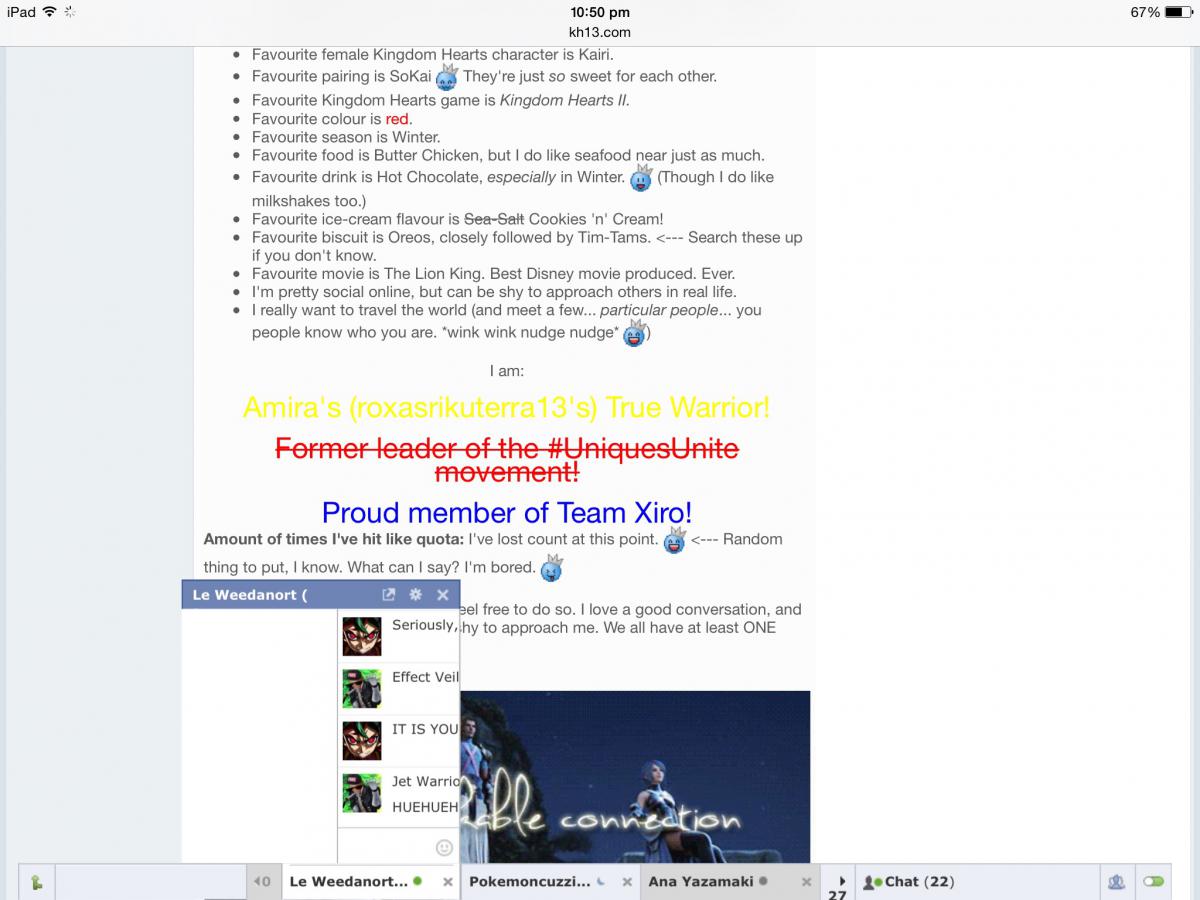 August 28, 201510 yr Aww, even when she's offline, you keep Ana's chatbox open. X3 When we used chat, I always kept yours open. X3 Ohhhhhhhhhh snap! (I never say that ever, so this is crazy. ) Weedy V.S Yuya = Curb Stomp Battle. Which way? No one knows. X3