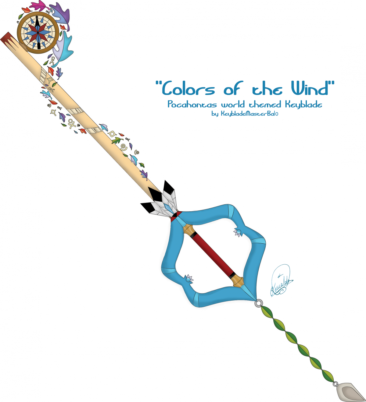 My keyblade is called "Colors of the Wind" from my most wanted in KH Disney film Pocahontas. I featured many elements of the spirited protagonist and her culture.
