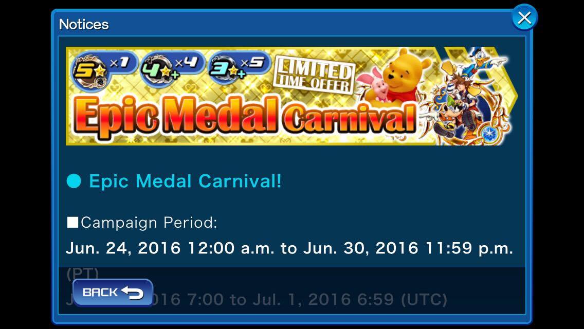 From June 24th at 12:00 PDT until June 30th at 11:59 PDT, a new Epic Medal Carnival deal will be available in both the NA and EU versions of Kingdom Hearts Unchained χ! This deal offers a limited edition illustrated medal of Sora & Donald & Goofy, as well as Pooh & Piglet, Xaldin, Saix, Xigbar, Demyx, and Luxord.