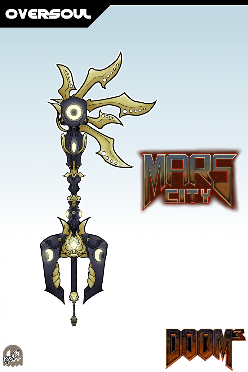 OVERSOUL - A Keyblade modeled after the Soul Cube from DOOM 3! This Keyblade is designed to maximize attacks and has a vampire heal technique. The Hilt guard of the Keyblade is designed after the standard appearance of the Soul Cube, and its outershell. The shaft of the blade is designed based on different interpretations of the Soul Cube's unique architecture. The Teeth of the blade are designed after the several blades that form out of the Soul Cube when it is used to attack a demon. The Keychain is one of the rings that appears when the Soul Cube attacks and the token is that of DOOM 3's variation of the Cacodemon. The name means that a divine spirit that presides over all souls. The world logo is Mars City, the location of DOOM 3, styled after DOOM 3's title.