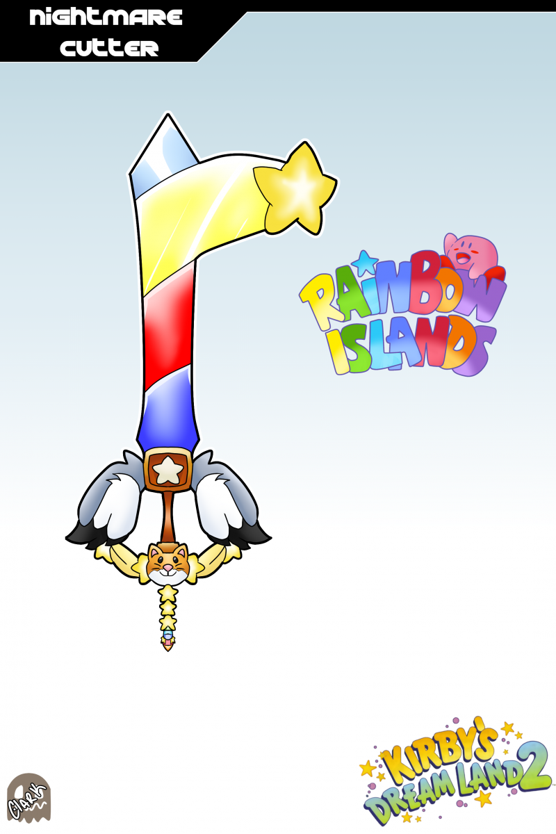 NIGHTMARE CUTTER - A Keyblade modeled after the Rainbow Sword and Animal friends in Kirby's Dream Land 2! This Keyblade is designed to have better reach and Aero capabilities! The hilt of the blade forms from a Star Block in the center, with Coo's wings and Kine's fins forming the rest of the Guard. The pomel is the head of Rick, with the shaft of the blade being the Rainbow Sword, with the rainbow that forms from it forming into the teeth of the blade. The chain is a series of stars, with the Rainbow Crystal being the token! The name comes from Kirby and Friends fighting off Nightmare/Dark Matter. The World Logo is named after the Rainbow Islands, which each set of letters corresponding to the colors of the islands.