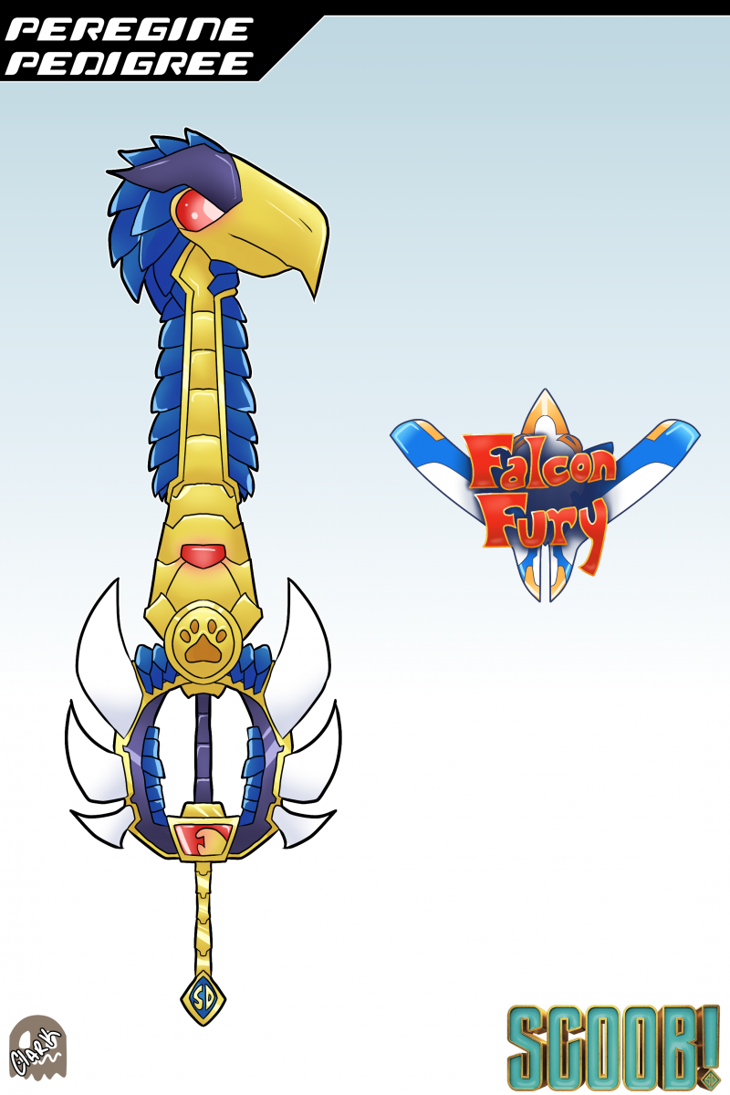 PEREGINE PEDIGREE - A Keyblade modeled after the Blue Falcon from Scoob! This Keyblade is designed to increase the power of Aero attacks! The hilt of the blade is designed after the Blue Falcon, with his logo at the pomel of the blade, and the center of the crossguard having the Paw Print key hole. The shaft and teeth of the blade is further designed after Blue Falcon's costume, notably the cowl. The Keychain is designed after Scooby's hero suit, with the token being the dog tag. The World Logo is designed after the Blue Falcon's personal ship, the Falcon Fury. The name is a reference to the Blue Falcon in this movie being the second one, along with Scooby's own family line.