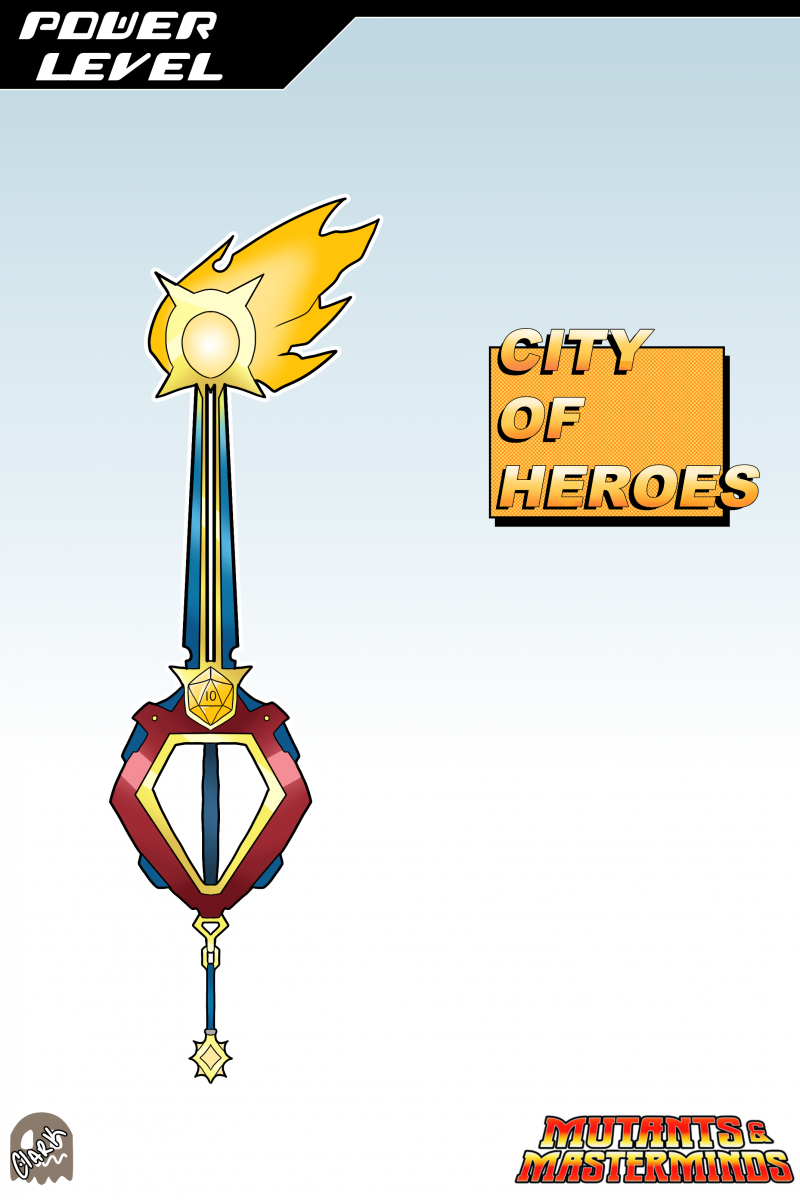 POWER LEVEL- A Keyblade designed after the Heroic nature of Mutants and Masterminds! This Keyblade is designed to randomly max out a single stat at any given time! The hilt and saft of the blade is designed to have a clean and heroic feel to it, with the teeth of the blade being a burning fire of determination! In the center of the crossguard is another D20. The token is a sparkle, much like the fire above. The World logo is designed to be a generic Hero city, with classic comic book stylings. The name comes from the character creation, using power level points to buy special abilities.