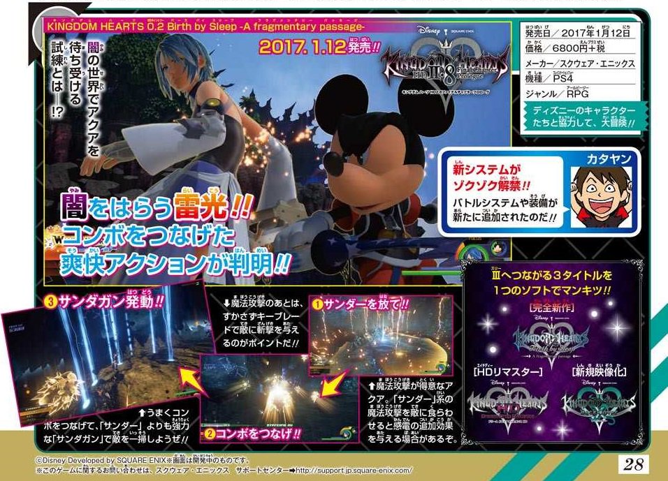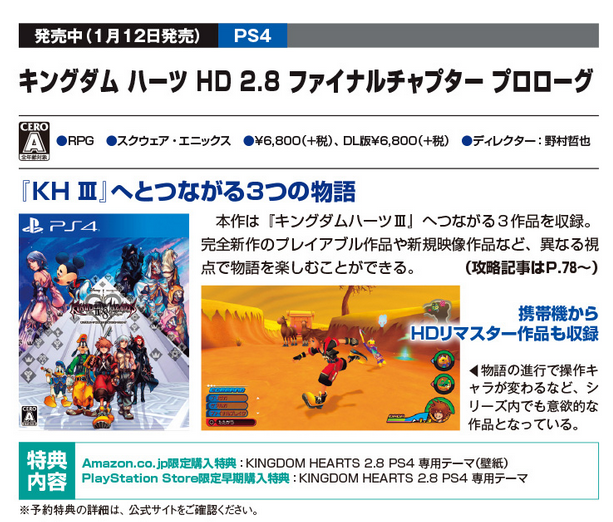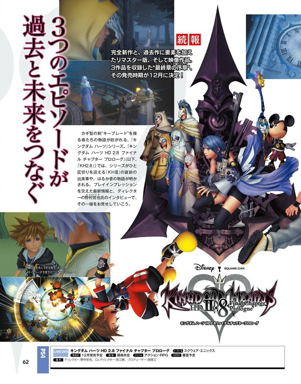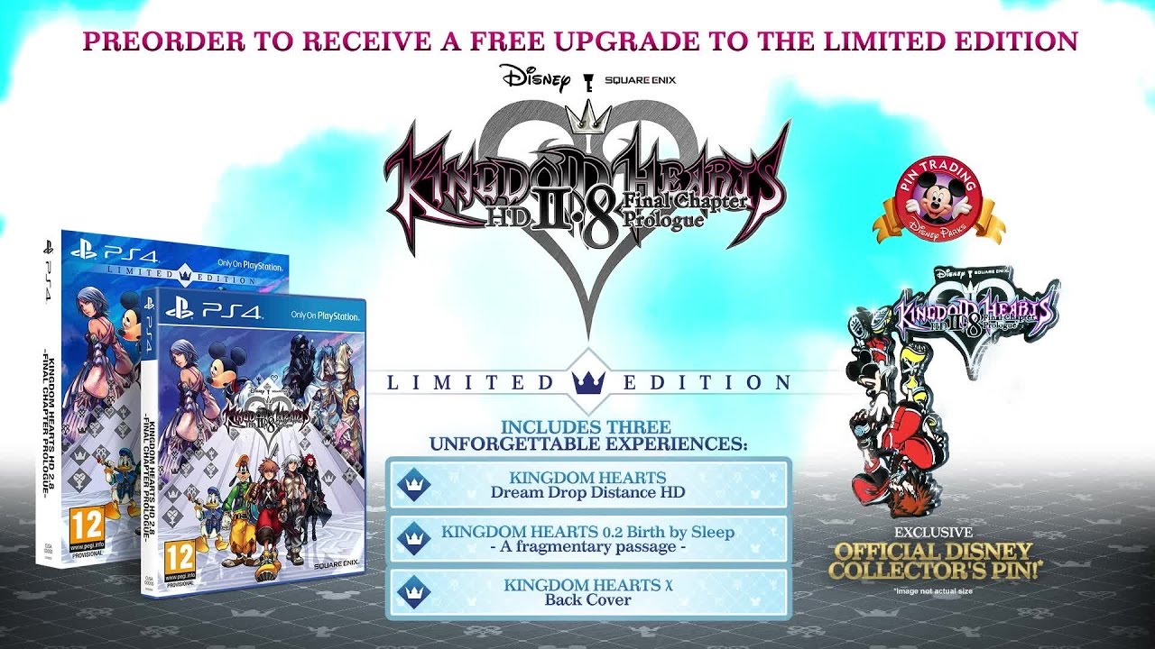 Kingdom Hearts HD 2.8 Final Chapter Prologue is an HD remaster compilation consisting of Kingdom Hearts Dream Drop Distance HD, a new movie titled Kingdom Hearts χ Back Cover and a new short title, Kingdom Hearts 0.2 Birth by Sleep -A Fragmentary Passage-, releasing on the PlayStation 4 in Japan (January 12, 2017) and North America, Europe and Australia on January 24, 2017.