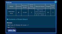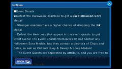 From Oct. 7th until 11:59 PM PT Oct. 20th, 2016, battle Halloween Heartless to get a 3★Halloween Sora medal! You can also earn event coins by defeating Heartless to win Chip, Dale, as well Huey & Dewey & Louie medals! The event quests are separated by attribute, so you can pick and choose what quests to do to your preference. For all contents of the event board and a chart of the Halloween Sora medal's stats, please check the gallery below. Also please note that stronger Heartless have a higher chance of dropping the Halloween Sora medal! From Oct. 7th until 11:59 PM PT Oct. 13th, 2016, there's a special 5 medal deal named the Score Assistance Deal! This deal will give you one 6★ medal and also guarantees that all five of the medals drawn will provide a score bonus for the ongoing High Score Challenge! On top of that, players will also receive a 6★ Huey & Dewey & Louie medal! A list of all the medals included in this deal is included in the gallery below: Will you be taking advantage of this deal? Or are you more interested in the Halloween Sora medal? Let us know in the comments!
