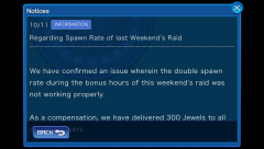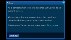 The international version of KHUX has posted a notice stating that they had confirmed an issue with the double spawn rate during the bonus hours of the previous weekend's raid not working properly. In compensation, 300 jewels have been gifted to all current players. You can check out images of the notices below: