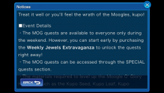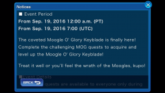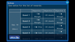 The Moogle of Glory Keyblade is here! MOG quests will be available only during the weekends, unless you purchase the Weekly Jewels Extravaganza to unlock the quests right away. MOG quests can be accessed through the Special Quests section. From Sept. 19th until 11:59 PM (PT) on Sept. 25th, there will be a new Challenge event taking place! 5 new quests will be added on Sept. 19th, Sept. 20th, Sept. 22nd, and Sept. 24th. Complete the objectives of these quests to earn jewels, boost medals, cost medals, munny medals, and exp medals! A chart of the quests and their rewards can be found in the gallery below. Are you looking forward to trying out the Moogle O' Glory Keyblade? Let us know in the comments!
